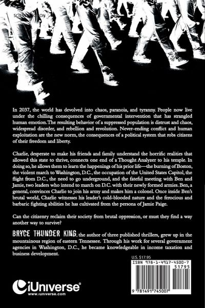 In 2037, the world has devolved into chaos, paranoia, and tyranny. People now live under the chilling consequences of governmental intervention that has strangled human emotion. The resulting behavior of a suppressed population is distrust and chaos, widespread disorder, and rebellion and revolution. Never-ending conflict and human exploitation are the new norm, the consequences of a political system that robs citizens of their freedom and liberty. Charlie, desperate to make his friends and family understand the horrific realities that allowed this state to thrive, connects one end of a Thought Analyzer to his temple. In doing so, he allows them to learn the happenings of his prior life-the burning of Boston, the violent march to Washington, D.C., the occupation of the United States Capitol, the flight from D.C., the need to go underground, and the fateful meeting with Ben and Jamie, two leaders who intend to march on D.C. with their newly formed armies. Ben, a general, convinces Charlie to join his army and makes him a colonel. Once inside Ben's brutal world, Charlie witnesses his leader's cold-blooded nature and the ferocious and barbaric fighting abilities he has cultivated from the persona of Jamie Paige. Can the citizenry reclaim their society from brutal oppression, or must they find a way another way to survive?