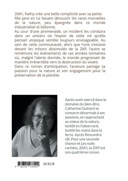2041, Kathy crée une belle complicité avec sa petite-fille Jane en lui faisant découvrir les rares merveilles de la nature, peu épargnée dans ce monde industrialisé et bétonné. Au cours d'une promenade, un incident les conduira dans un univers où l'espoir de cette vie qu'elle pensait utopique semble toujours envisageable. Au sein de cette communauté, alors que l'une s'extasie devant les trésors dissimulés de la ZAP, l'autre se remémore les événements de ces années lointaines où, malgré l'alerte donnée, le monde progressait de manière irréversible vers la destruction du vivant. Dans ce roman d'anticipation, l'auteure partage sa passion pour la nature et son engagement pour la préservation de la planète.