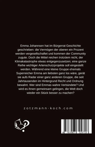 Emma Johannsen hat im Bürgerrat Geschichte geschrieben: die Vermögen der oberen ein Prozent werden vergesellschaftet und kommen der Community zugute. Doch die Mittel reichen trotzdem nicht, der Klimakatastrophe etwas entgegenzusetzen; eine ganze Reihe wichtiger Artenschutzprojekte soll eingestellt werden. Während eine kleine Gruppe ehemals Superreicher Emma am liebsten ganz los wäre, gerät sie aufs Radar einer ganz anderen Gruppe, die seit Jahrtausenden im Hintergrund Recht und Ordnung bewahrt. Wer sind Emmas wahre Verbündete? Und wird es ihnen gemeinsam gelingen, die Welt doch wieder ein Stück besser zu machen?