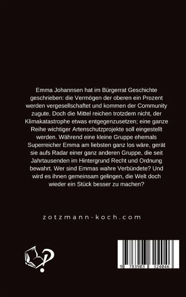 Emma Johannsen hat im Bürgerrat Geschichte geschrieben: die Vermögen der oberen ein Prozent werden vergesellschaftet und kommen der Community zugute. Doch die Mittel reichen trotzdem nicht, der Klimakatastrophe etwas entgegenzusetzen; eine ganze Reihe wichtiger Artenschutzprojekte soll eingestellt werden. Während eine kleine Gruppe ehemals Superreicher Emma am liebsten ganz los wäre, gerät sie aufs Radar einer ganz anderen Gruppe, die seit Jahrtausenden im Hintergrund Recht und Ordnung bewahrt. Wer sind Emmas wahre Verbündete? Und wird es ihnen gemeinsam gelingen, die Welt doch wieder ein Stück besser zu machen?