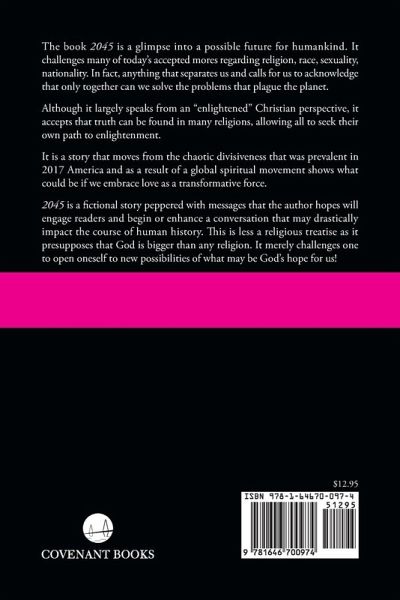 The book 2045 is a glimpse into a possible future for humankind. It challenges many of today's accepted mores regarding religion, race, sexuality, nationality. In fact, anything that separates us and calls for us to acknowledge that only together can we solve the problems that plague the planet. Although it largely speaks from an "enlightened" Christian perspective, it accepts that truth can be found in many religions, allowing all to seek their own path to enlightenment. It is a story that moves from the chaotic divisiveness that was prevalent in 2017 America and as a result of a global spiritual movement shows what could be if we embrace love as a transformative force. 2045 is a fictional story peppered with messages that the author hopes will engage readers and begin or enhance a conversation that may drastically impact the course of human history. This is less a religious treatise as it presupposes that God is bigger than any religion. It merely challenges one to open oneself to new possibilities of what may be God's hope for us!