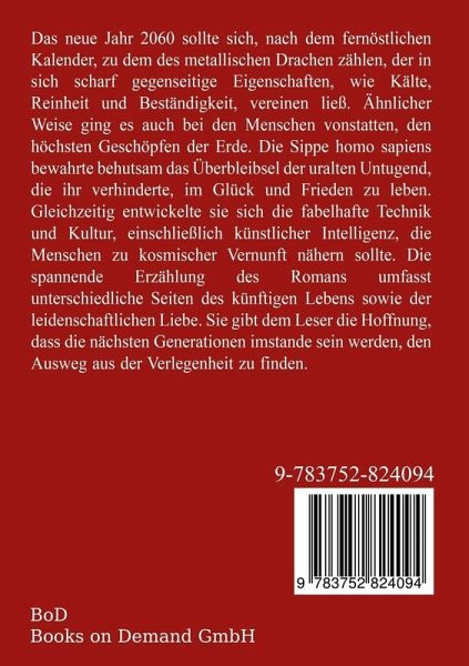 Das neue Jahr 2060 sollte sich, nach dem fernöstlichen Kalender, zu dem des metallischen Drachen zählen, der in sich scharf gegenseitige Eigenschaften, wie Kälte, Reinheit und Beständigkeit, vereinen ließ. Ähnlicherweise ging es auch bei den Menschen vonstatten, den höchsten Geschöpfen der Erde. Die Sippe homo sapiens bewahrte behutsam das Überbleibsel der uralten Untugend, die ihr verhinderte, im Glück und Frieden zu leben. Gleichzeitig entwickelte sich die fabelhafte Technik und Kultur, einschließlich künstlicher Intelligenz, die Menschen zu kosmischer Vernunft nähern sollte. Die spannende Erzählung des Romans umfasst unterschiedliche Seiten des künftigen Lebens sowie der leidenschaftlichen Liebe. Sie gibt dem Leser die Hoffnung, dass die nächsten Generationen imstande sein werden, den Ausweg aus der Verlegenheit zu finden.
