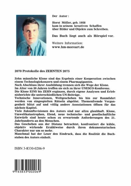 Zehn männliche Klone sind das Ergebnis einer Kooperation zwischen einem Technologiekonzern und einem Pharmagiganten. Nach Abschluss ihrer Ausbildung trennen sich die Wege der Klone. Im Alter von 20 Jahren treffen sie sich zu ihrer UNESCO-Konferenz. Die Klone EINS bis ZEHN ergänzen, durch eigene Analysen und Erlebnisberichte die unterschiedlichen UN-Beiträge. Technische Innovationen, Weltgeschehen bis hin zur Raumfahrt werden von eingespielten Rätseln abgelöst. Themenfremde Vergangenheit blitzt auf und völlig andere Assoziationen öffnen für das nächste Kapitel. Viele Zukunftsvisionen des Autors sind nur allzu glaubhaft. Klone, Umweltkatastrophen, Elend, neue technische- und gesellschaftliche Entwürfe sind heute schon zu erwartende Anforderungen des 21. Jahrhunderts an den Menschen. Das Geschehen aus der Distanz betrachtet, konfrontiert die kühle, objektiv wirkende Erzählweise durch ihren dokumentarischen Charakter nur um so mehr. Manchmal hat der Leser den Eindruck, dass die Realität die Buchstaben des Autors einholt. Auch als Hörspiel 5:10:00 5 CDs oder 1 MP3 erhältlich. Probe hören und weitere Information unter www.hm-moreart.de.
