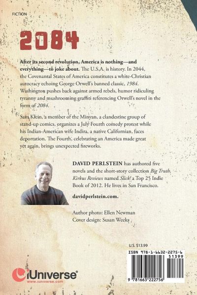 After its second revolution, America is nothing-and everything-to joke about. The U.S.A. is history. In 2044, the Covenantal States of America constitutes a white-Christian autocracy echoing George Orwell's banned classic, 1984. Washington pushes back against armed rebels, humor ridiculing tyranny and mushrooming graffiti referencing Orwell's novel in the form of 2084. Sam Klein, a member of the Minyan, a clandestine group of stand-up comics, organizes a July Fourth comedy protest while his Indian-American wife Indira, a native Californian, faces deportation. The Fourth, celebrating an America made great yet again, brings unexpected fireworks.