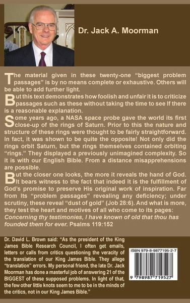 Dr. Jack Moorman went to his home in glory in 2021. We have lost a great student and scholar of the Scriptures. He is missed.Jack A. Moorman studied for a while at the Indianapolis campus of Purdue University, attended briefly Indiana Bible College, and graduated from Tennessee Temple Bible School. He was with Baptist International Missions Inc. (BIMI) since 1967 and was involved in church planting, Bible Institute teaching and extensive distribution of Scriptures and gospel tracts in Johannesburg, South Africa from 1968-1988, and in England and London since 1988. He married his wife, Dot, on November 22, 1963.J.A. Moorman has written the following scholarly books defending the King James Bible and the Hebrew, Aramaic and Greek words that underlie it:When the KJV Departs from the "Majority" Text.Early Manuscripts, Church Fathers, and the Authorized Version.Forever Settled.Missing in Modern Bibles-The Old Heresy Revived.Samuel P. Tregelles-The Man Who Made the Critical Text Acceptable to Bible Believers.8,000 Differences Between the Textus Receptus and the Critical Text.Bible Chronology: The Two Great Divides.The Biblical and Observational Case for Geocentricity.These well-documented works are replete with evidence which he gleaned from his own resources as well as references found in the British Museum, British Library and other libraries in South Africa and the United Kingdom.He was the pastor of Bethel Baptist Church in London, England since 1993. A great deal of his time, and on a nearly daily basis, was spent in distributing Gospel Literature on the crowded streets of London and beyond. May God bless his unfailing service to the Lord Jesus Christ.Dr. Moorman has written many books and articles. Here are a few that are available through "The Old Paths Publications":http://theoldpathspublications.com/Pages/BookStore.htm1.Missing in Modern Bibles2.Was Codex Sinaiticus Written In 1840?3.Delivered from the Wrath to Come: A Study of the Pretribulational Rapture4.Early Manuscripts, Church Fathers, and the Authorized Version5.The Church, the Beginning, Baptism, Body, and Bride6.The Biblical and Observational Case for Geocentricity7.8,000 Differences Between the N.T. Greek Words of the King James Bible and the Modern Versions8.When the KJV Departs From the "Majority" Text9.Bible Chronology - The Two Great Divides10.Forever Settled, A Survey of the Document and History of the Bible11.Genesis to the Exodus12.Daniel: The Times of the Gentiles and the Times of Jerusalem13.Revelation: God's Final WordYou may contact us by email:TOP@theoldpathspublications.comPAT@theoldpathspublications.com H.D. Williams, M.D., Ph.D., PresidentThe Old Paths Publications