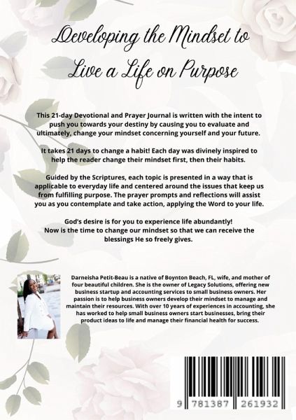 God's desire is for you to experience life abundantly! Now is the time to change our mindset so that we can receive the blessings He so freely gives. This 21-day devotional and prayer journal is written with the intent to push you towards your destiny by causing you to evaluate and ultimately, change your mindset concerning yourself and your future. Guided by the Scriptures, each topic is presented in a way that is applicable to everyday life and centered around the issues that keep us from fulfilling purpose. The prayer prompts and reflections will assist you as you contemplate and take action, applying the Word to your life. Psalms 119:130 ERV "As people understand your word, it brings light to their lives. Your word makes even simple people wise."