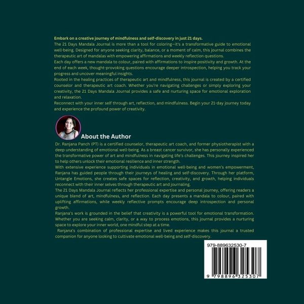 Embark on a creative journey of mindfulness and self-discovery in just 21 days. The 21 Days Mandala Journal is more than a tool for colouring-it's a transformative guide to emotional well-being. Designed for anyone seeking clarity, balance, or a moment of calm, this journal combines the therapeutic art of mandalas with empowering affirmations and weekly reflection questions. Each day offers a new mandala to colour, paired with affirmations to inspire positivity and growth. At the end of each week, thought-provoking questions encourage deeper introspection, helping you track your progress and uncover meaningful insights. Rooted in the healing practices of therapeutic art and mindfulness, this journal is created by a certified counselor and therapeutic art coach. Whether you're navigating challenges or simply exploring your creativity, the 21 Days Mandala Journal provides a safe and nurturing space for emotional exploration and relaxation. Reconnect with your inner self through art, reflection, and mindfulness. Begin your 21-day journey today and experience the profound power of creativity.