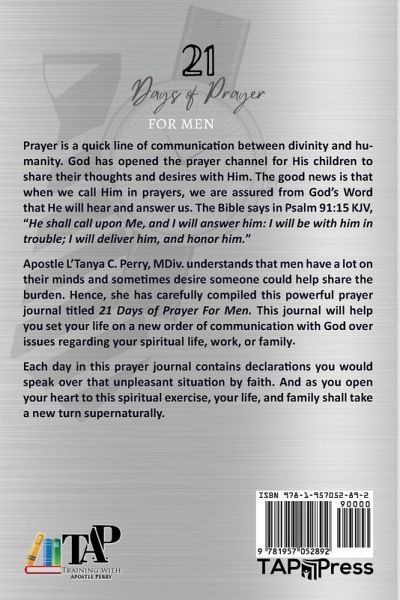 Prayer is a quick line of communication between divinity and humanity. God has opened the prayer channel for His children to share their thoughts and desires with Him. The good news is that when we call Him in prayers, we are assured from God's Word that He will hear and answer us. The Bible says in Psalm 91:15 KJV, "He shall call upon Me, and I will answer him: I will be with him in trouble; I will deliver him, and honor him." Apostle L'Tanya C. Perry, MDiv. understands that men have a lot on their minds and sometimes desire someone could help share the burden. Hence, she has carefully compiled this powerful prayer journal titled 21 Days of Prayer For Men. This journal will help you set your life on a new order of communication with God over issues regarding your spiritual life, work, or family. Each day in this prayer journal contains declarations you would speak over that unpleasant situation by faith. And as you open your heart to this spiritual exercise, your life and family shall take a new turn supernaturally.
