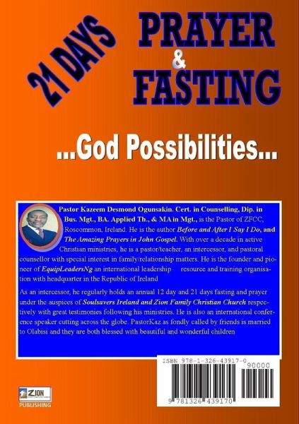 This is a handbook guide for a devotional twenty-one day Christian prayer and fasting. This small prayer guide booklet will help the user to enter into the possibilities of the Lord this season in Jesus name. The motivation to produce this small booklet before our Church 2015 annual 21 days possibilities fasting and prayer in October came while I was trusting God for something very crucial to me and was praying and trusting the Lord, right in the midst of seeking God's face continually the answer came.