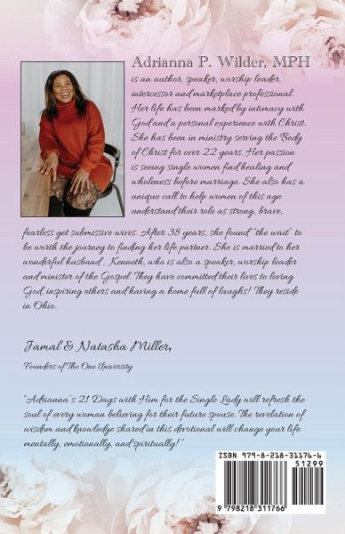 21 days with Him...for the single lady, is a book about cultivating intimacy, healing and identity with God while on the road to marriage. The author takes you on 14 days of her personal story on how she found marriage at almost 38 years old and the journey that led her to finding God's best for her. It is about becoming whole before marriage. The book includes 21 days of guided journal prompts which lead the reader into praying for herself and her future marriage effectively. This book is great for solo devotional time or small group engagement.