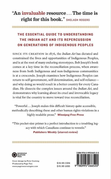 #1 National Bestseller Based on a viral article, 21 Things You May Not Know About the Indian Act is the essential guide to understanding the legal document and its repercussion on generations of Indigenous Peoples, written by a leading cultural sensitivity trainer. Since its creation in 1876, the Indian Act has shaped, controlled, and constrained the lives and opportunities of Indigenous Peoples, and is at the root of many enduring stereotypes. Bob Joseph’s book comes at a key time in the reconciliation process, when awareness from both Indigenous and non-Indigenous communities is at a crescendo. Joseph explains how Indigenous Peoples can step out from under the Indian Act and return to self-government, self-determination, and self-reliance—and why doing so would result in a better country for every Canadian. He dissects the complex issues around truth and reconciliation, and clearly demonstrates why learning about the Indian Act’s cruel, enduring legacy is essential for the country to move toward true reconciliation.