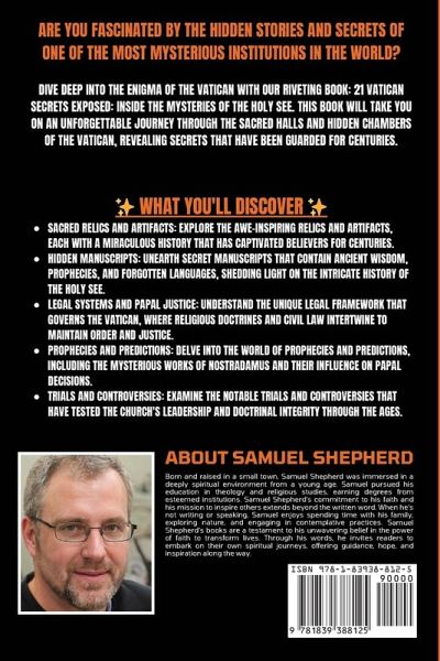 ¿¿¿¿ 21 Vatican Secrets Exposed: Inside The Mysteries Of The Holy See ¿¿¿¿ Are you fascinated by the hidden stories and secrets of one of the most mysterious institutions in the world? ¿¿¿¿ Dive deep into the enigma of the Vatican with our riveting book: 21 Vatican Secrets Exposed: Inside The Mysteries Of The Holy See. This book will take you on an unforgettable journey through the sacred halls and hidden chambers of the Vatican, revealing secrets that have been guarded for centuries. ¿ What You'll Discover ¿ ¿¿¿¿ Sacred Relics and Artifacts: Explore the awe-inspiring relics and artifacts, each with a miraculous history that has captivated believers for centuries. ¿¿¿¿ Hidden Manuscripts: Unearth secret manuscripts that contain ancient wisdom, prophecies, and forgotten languages, shedding light on the intricate history of the Holy See. ¿¿ Legal Systems and Papal Justice: Understand the unique legal framework that governs the Vatican, where religious doctrines and civil law intertwine to maintain order and justice. ¿¿¿¿¿¿¿¿ Prophecies and Predictions: Delve into the world of prophecies and predictions, including the mysterious works of Nostradamus and their influence on papal decisions. ¿¿¿¿ Trials and Controversies: Examine the notable trials and controversies that have tested the Church's leadership and doctrinal integrity through the ages. ¿¿¿¿ Why This Book is a Must-Have ¿¿¿¿ Exclusive Insights: Gain access to meticulously researched secrets that provide a deeper understanding of the Vatican. Engaging and Informative: Written in a captivating narrative style, this book is perfect for history buffs, religious scholars, and curious minds alike. Beautifully Illustrated: Rich illustrations and detailed descriptions bring the Vatican's secrets to life. A Unique Gift: This book makes an exceptional gift for anyone fascinated by history, religion, or the Vatican's allure. ¿¿¿¿ Embark on Your Journey ¿¿¿¿ Don't miss your chance to explore the mysteries and secrets of the Holy See with 21 Vatican Secrets Exposed: Inside The Mysteries Of The Holy See. This book offers a rare glimpse into the hidden world of the Vatican, revealing the stories and secrets that have shaped its history. Order your copy today and embark on an enlightening journey through time and faith. ¿¿¿¿¿ ¿¿¿¿ Order Now Discover. Unveil. Believe. ¿¿¿¿