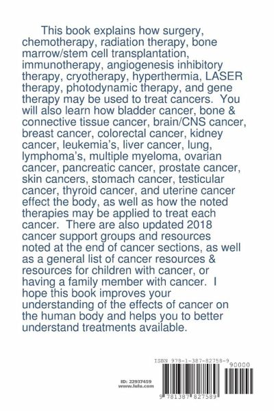 This book explains how surgery, chemotherapy, radiation therapy, bone marrow/stem cell transplantation, immunotherapy, angiogenesis inhibitory therapy, cryotherapy, hyperthermia, LASER therapy, photodynamic therapy, and gene therapy may be used to treat cancers. You will also learn how bladder cancer, bone & connective tissue cancer, brain/CNS cancer, breast cancer, colorectal cancer, kidney cancer, leukemia's, liver cancer, lung, lymphoma's, multiple myeloma, ovarian cancer, pancreatic cancer, prostate cancer, skin cancers, stomach cancer, testicular cancer, thyroid cancer, and uterine cancer effects the body; as well as treatments for each cancer. There are also updated 2018 cancer support groups & resources at the end of cancer sections, as well as a general list of cancer resources & resources for children with cancer, or having a family member with cancer. I hope this book improves your understanding of the effects of cancer on the human body and helps you to better understand treatments available.