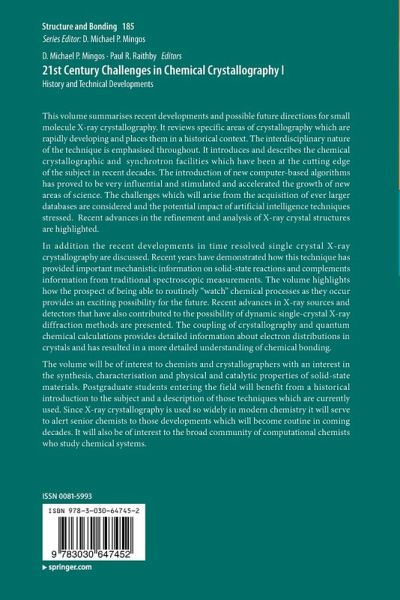 This volume summarises recent developments and possible future directions for small molecule X-ray crystallography. It reviews specific areas of crystallography which are rapidly developing and places them in a historical context. The interdisciplinary nature of the technique is emphasised throughout. It introduces and describes the chemical crystallographic and synchrotron facilities which have been at the cutting edge of the subject in recent decades. The introduction of new computer-based algorithms has proved to be very influential and stimulated and accelerated the growth of new areas of science. The challenges which will arise from the acquisition of ever larger databases are considered and the potential impact of artificial intelligence techniques stressed. Recent advances in the refinement and analysis of X-ray crystal structures are highlighted.
