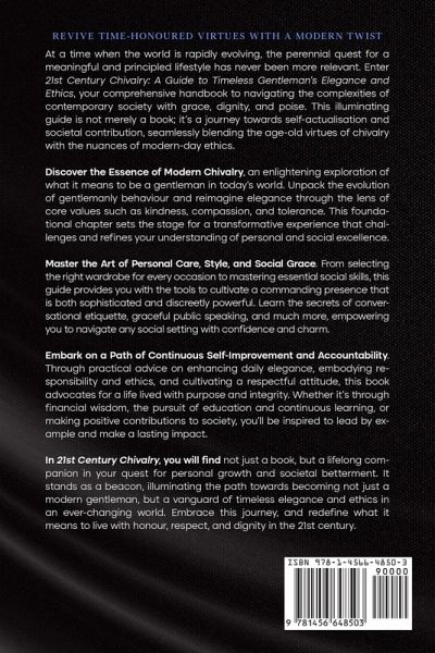 Revive Time-Honoured Virtues with a Modern Twist At a time when the world is rapidly evolving, the perennial quest for a meaningful and principled lifestyle has never been more relevant. Enter 21st Century Chivalry: A Guide to Timeless Gentleman's Elegance and Ethics , your comprehensive handbook to navigating the complexities of contemporary society with grace, dignity, and poise. This illuminating guide is not merely a book; it's a journey towards self-actualisation and societal contribution, seamlessly blending the age-old virtues of chivalry with the nuances of modern-day ethics. Discover the Essence of Modern Chivalry, an enlightening exploration of what it means to be a gentleman in today's world. Unpack the evolution of gentlemanly behaviour and reimagine elegance through the lens of core values such as kindness, compassion, and tolerance. This foundational chapter sets the stage for a transformative experience that challenges and refines your understanding of personal and social excellence. Master the Art of Personal Care, Style, and Social Grace. From selecting the right wardrobe for every occasion to mastering essential social skills, this guide provides you with the tools to cultivate a commanding presence that is both sophisticated and discreetly powerful. Learn the secrets of conversational etiquette, graceful public speaking, and much more, empowering you to navigate any social setting with confidence and charm. Embark on a Path of Continuous Self-Improvement and Accountability. Through practical advice on enhancing daily elegance, embodying responsibility and ethics, and cultivating a respectful attitude, this book advocates for a life lived with purpose and integrity. Whether it's through financial wisdom, the pursuit of education and continuous learning, or making positive contributions to society, you'll be inspired to lead by example and make a lasting impact. In 21st Century Chivalry, you will find not just a book, but a lifelong companion in your quest for personal growth and societal betterment. It stands as a beacon, illuminating the path towards becoming not just a modern gentleman, but a vanguard of timeless elegance and ethics in an ever-changing world. Embrace this journey, and redefine what it means to live with honour, respect, and dignity in the 21st century.