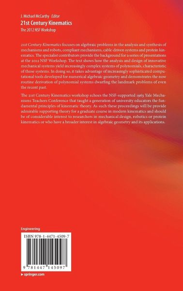 21st Century Kinematics focuses on algebraic problems in the analysis and synthesis of mechanisms and robots, compliant mechanisms, cable-driven systems and protein kinematics. The specialist contributors provide the background for a series of presentations at the 2012 NSF Workshop. The text shows how the analysis and design of innovative mechanical systems yield increasingly complex systems of polynomials, characteristic of those systems. In doing so, takes advantage of increasingly sophisticated computational tools developed for numerical algebraic geometry and demonstrates the now routine derivation of polynomial systems dwarfing the landmark problems of even the recent past. The 21st Century Kinematics workshop echoes the NSF-supported 1963 Yale Mechanisms Teachers Conference that taught a generation of university educators the fundamental principles of kinematic theory. As such these proceedings will be provide admirable supporting theory for a graduate course in modern kinematics and should be of considerable interest to researchers in mechanical design, robotics or protein kinematics or who have a broader interest in algebraic geometry and its applications.