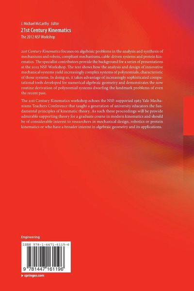 21st Century Kinematics focuses on algebraic problems in the analysis and synthesis of mechanisms and robots, compliant mechanisms, cable-driven systems and protein kinematics. The specialist contributors provide the background for a series of presentations at the 2012 NSF Workshop. The text shows how the analysis and design of innovative mechanical systems yield increasingly complex systems of polynomials, characteristic of those systems. In doing so, it takes advantage of increasingly sophisticated computational tools developed for numerical algebraic geometry and demonstrates the now routine derivation of polynomial systems dwarfing the landmark problems of even the recent past. The 21st Century Kinematics workshop echoes the NSF-supported 1963 Yale Mechanisms Teachers Conference that taught a generation of university educators the fundamental principles of kinematic theory. As such these proceedings will provide admirable supporting theory for a graduate course in modern kinematics and should be of considerable interest to researchers in mechanical design, robotics or protein kinematics or who have a broader interest in algebraic geometry and its applications.