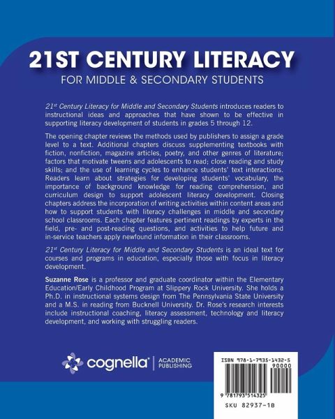 21st Century Literacy for Middle and Secondary Students introduces readers to instructional ideas and approaches that have shown to be effective in supporting literacy development of students in grades 5 through 12. The opening chapter reviews the methods used by publishers to assign a grade level to a text. Additional chapters discuss supplementing textbooks with fiction, nonfiction, magazine articles, poetry, and other genres of literature; factors that motivate tweens and adolescents to read; close reading and study skills; and the use of learning cycles to enhance students' text interactions. Readers learn about strategies for developing students' vocabulary, the importance of background knowledge for reading comprehension, and curriculum design to support adolescent literacy development. Closing chapters address the incorporation of writing activities within content areas and how to support students with literacy challenges in middle and secondary school classrooms. Each chapter features pertinent readings by experts in the field, pre- and post-reading questions, and activities to help future and in-service teachers apply newfound information in their classrooms. 21st Century Literacy for Middle and Secondary Students is an ideal text for courses and programs in education, especially those with focus in literacy development. Suzanne Rose is a professor and graduate coordinator within the Elementary Education/Early Childhood Program at Slippery Rock University. She holds a Ph.D. in instructional systems design from The Pennsylvania State University and a M.S. in reading from Bucknell University. Dr. Rose's research interests include instructional coaching, literacy assessment, technology and literacy development, and working with struggling readers.
