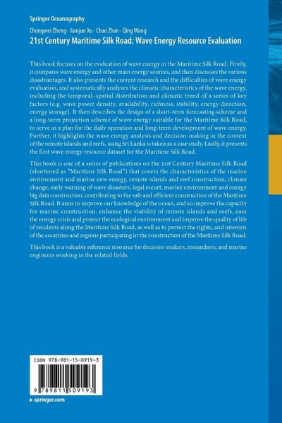 This book focuses on the evaluation of wave energy in the Maritime Silk Road. Firstly, it compares wave energy and other main energy sources, and then discusses the various disadvantages. It also presents the current research and the difficulties of wave energy evaluation, and systematically analyzes the climatic characteristics of the wave energy, including the temporal-spatial distribution and climatic trend of a series of key factors (e.g. wave power density, availability, richness, stability, energy direction, energy storage). It then describes the design of a short-term forecasting scheme and a long-term projection scheme of wave energy suitable for the Maritime Silk Road, to serve as a plan for the daily operation and long-term development of wave energy. Further, it highlights the wave energy analysis and decision-making in the context of the remote islands and reefs, using Sri Lanka is taken as a case study. Lastly, it presents the first wave energy resource dataset for theMaritime Silk Road.
