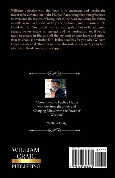 William's objective with this book is to encourage and inspire the reader to be a champion in the Human Race, using the strategy he used to overcome the trauma of being shot in the head and losing his ability to walk, as well as his wife of 15 years, his home, and his business. He found that his "joy deficit" was something that had to be addressed because no joy means no strength and no motivation. So, if you're ready to elevate in life, and fill the joy-send of your heart and mind, then this book is a valuable find. If this book has for you what William hopes is its desired effect, please share this with others so they can find relief also. Thank you for your support.