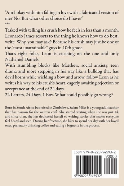 "Am I okay with him falling in love with a fabricated version of me? No. But what other choice do I have?" *** Tasked with telling his crush how he feels in less than a month, Leonardo James resorts to the thing he knows how to do best: write. Why, you may ask? Because his crush may just be one of the "most unattainable" guys in 10th grade. That's right folks, Leon is crushing on the one and only Nathaniel Daniels. With stumbling blocks like Matthew, social anxiety, teen drama and more stepping in his way like a bulldog that has devil horns while wielding a bow and arrow, follow Leon as he writes his way to his crush's heart, eagerly awaiting rejection or acceptance at the end of 24 days. 22 Letters, 24 Days, 1 Boy. What could possibly go wrong?