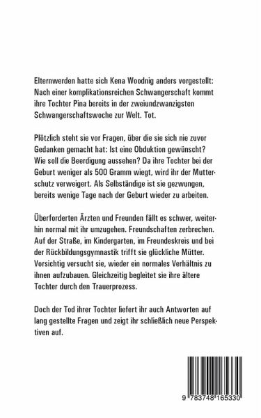 Elternwerden hatte sich Kena Woodnig anders vorgestellt: Nach einer komplikationsreichen Schwangerschaft kommt ihre Tochter Pina bereits in der zweiundzwanzigsten Schwangerschaftswoche zur Welt. Tot.Plötzlich steht sie vor Fragen, über die sie sich nie zuvor Gedanken gemacht hat: Ist eine Obduktion gewünscht? Wie soll die Beerdigung aussehen? Da ihre Tochter bei der Geburt weniger als 500 Gramm wiegt und damit als Fehlgeburt und nicht als Totgeburt gilt, wird ihr der Mutterschutz verweigert. Als Selbständige ist sie gezwungen, bereits wenige Tage nach der Geburt wieder zu arbeiten.Überforderten Ärzten und Freunden fällt es schwer, weiterhin normal mit ihr umzugehen. Freundschaften zerbrechen. Auf der Straße, im Kindergarten, im Freundeskreis und bei der Rückbildungsgymnastik trifft sie glückliche Mütter. Vorsichtig versucht sie, wieder ein normales Verhältnis zu ihnen aufzubauen. Gleichzeitig begleitet sie ihre ältere Tochter durch den Trauerprozess.Authentisch schildert Kena Woodnig ihren Weg mit ihrem Sternenkind. Doch der Tod ihrer Tochter liefert ihr auch Antworten auf lang gestellte Fragen und zeigt ihr schließlich neue Perspektiven auf.