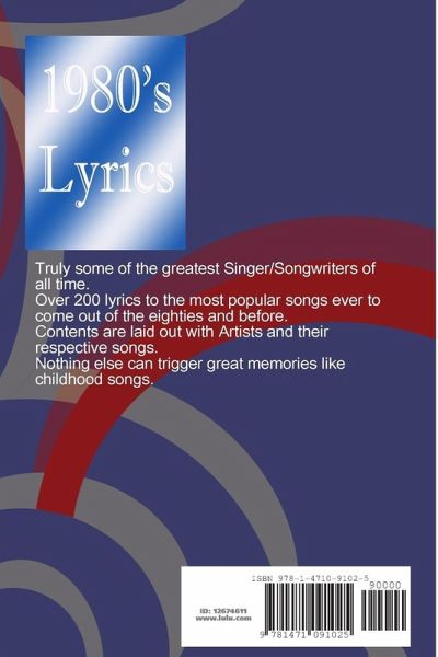 Contained in this book are the lyrics to over 200 of the greatest songs of the 80's. Contents are an easy layout containing the Artist and their songs for easy searching. Grab a copy and I guarantee it will bring back the memories.