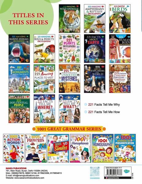 The book ""221 Facts Tell Me What"" is a fascinating and informative compendium that promises to expand your knowledge and spark your curiosity. With its size of 11 inches by 8.75 inches and high-quality 150 gsm paper, this book offers a visually appealing reading experience. The pages of this book are adorned with stunning HD images that bring the topics to life. The attractive and colorful illustrations engage readers of all ages, making learning an enjoyable experience. The book's best quality art paper ensures durability and enhances the visual appeal, while the glossy finish cover adds a touch of elegance. ""221 Facts Tell Me What"" covers a wide range of topics, encompassing more than 200 subjects. From science and history to nature and technology, this book offers a comprehensive exploration of various fields of knowledge. The topics are presented in an easy-to-understand language, making it accessible to readers of different age groups and educational backgrounds. Whether you are a student, a curious individual, or simply someone who loves acquiring interesting facts, this book has something to offer. It serves as a valuable educational resource, providing nuggets of information that are both engaging and enlightening. You will find yourself captivated by the intriguing facts presented on each page. Delve into the mysteries of science and unravel the secrets of the natural world. Discover fascinating historical events and gain insights into the workings of the human body. Explore the wonders of technology and marvel at the achievements of mankind. With ""221 Facts Tell Me What,"" you can embark on a journey of discovery from the comfort of your own home. This book is not only informative but also a source of inspiration and conversation. It encourages readers to delve deeper into various subjects, sparking curiosity and a thirst for knowledge. Whether you want to impress your friends with interesting trivia or simply satisfy your own inquisitive nature, ""221 Facts Tell Me What"" is the perfect companion. Expand your knowledge, broaden your horizons, and indulge in the joy of learning with this remarkable book. Immerse yourself in its pages and let the captivating facts transport you to new realms of understanding. With its comprehensive coverage, easy language, and visually stunning presentation, ""221 Facts Tell Me What"" is a must-have addition to any bookshelf. Embrace the opportunity to explore the world around you and discover the wonders that lie within ""221 Facts Tell Me What."" Open its pages and let the journey begin.