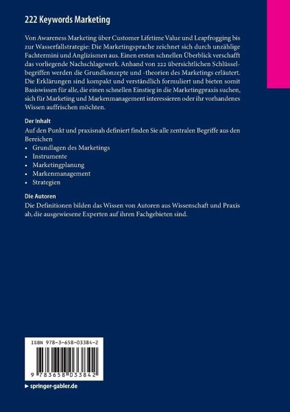 Von Awareness Marketing über Customer Lifetime Value und Leapfrogging bis zur Wasserfallstrategie: Die Marketingsprache zeichnet sich durch unzählige Fachtermini und Anglizismen aus. Einen ersten schnellen Überblick verschafft das vorliegende Nachschlagewerk. Anhand von 222 übersichtlichen Schlüsselbegriffen werden die Grundkonzepte und -theorien des Marketings erläutert. Die Erklärungen sind kompakt und verständlich formuliert und bieten somit Basiswissen für alle, die einen schnellen Einstieg in die Marketingpraxis suchen, sich für Marketing und Markenmanagement interessieren oder ihr vorhandenes Wissen auffrischen möchten.