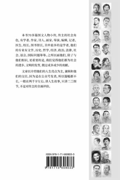 这本书的内容是丁东和邢小群夫妻的图文配。图为邢小群的素描人像。文除了少数几篇出自邢小群之手,多为丁东执笔。 中国古代有"士农工商"之说,"士"大略相当于今天的知识阶层。士林即复数的知识分子。本书包括 70 多人的画像和小传。他们共同的身份,都是广义上的知识分子。 这70 多篇图文配,是 70 篇人物小传,传主的社会角色,有学者、作家、诗人、画家、导演、编辑,记者、医生、校长、图书馆长,其中最多的是学者,他们的专业有文学、历史、哲学、经济、政治、法律、社会、语言、国际问题等等。之所以画他们,除了与他们相识,更重要的是,他们都为社会的进步、文明的发育,做过贡献。文章以介绍他们的人生亮点为主,兼顾和他们的交往。