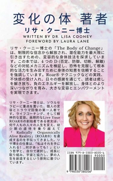 リサ・クーニー博士は、ソウルセラピーに重点を置いた、個人の変容とトラウマ回復の第一人者です。 ライフコーチング、そして精神的な変容。画期的なLive Your ROAR(R)の創始者である彼女は、何千人もの人々の人生を変え、幼少期の虐待を乗り越えて「Radically Orgasmically Alive Reality」(ROAR(R))を達成するのを手伝ってきました。リサ博士の仕事は、「私はそれを手に入れる!...何があっても!」という哲学と、自分で選択し、成長に取り組み、宇宙と協力し、夢の人生を創造するという原則に基づいています。 リサ・クーニー博士の「The Body of Change」は、制限的な信念から解放され、潜在能力を最大限に引き出すための、変容的な身体技法を探求しています。この本では、4 つの D (否定、防御、切断、解離) などの対処メカニズムを検証し、恐怖を克服して根本的な活力を生み出すために身体の知恵を信頼することを強調しています。Roar(R) テクニックなどの実践、不快感の受け入れ、日々の感謝を通じて、読者は癒しを解き放ち、負のエネルギーを解放し、身体とのより深いつながりを育み、大きな変容とエンパワーメントを実現できます。