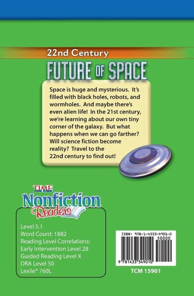 Travel to the 22nd century in this captivating nonfiction title that allows readers to discover the future of space. Elementary readers will be fascinated with the possibilities that may await human life in the future. Readers will learn about the technology that may be used to one day allow humans to live on another planet, new worlds, alien life, and artificial intelligence. Featuring Time For Kids(c) content, informational text, engaging diagrams, and vibrant images and photos, children will be excited and enthralled as they read through this title. This book also includes text features such as a table of contents, glossary, and index, as well as resources like a bibliography and a list of useful websites to explore more on the topic of space science.