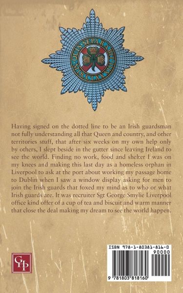 Having signed on the dotted line to be an Irish guardsman not fully understanding all that Queen and country, and other territories stuff, that after six weeks on my own help only by others, I slept beside in the gutter since leaving Ireland to see the world. Finding no work, food and shelter I was on my knees and making this last day as a homeless orphan in Liverpool to ask at the port about working my passage home to Dublin when I saw a window display asking for men to join the Irish guards that foxed my mind as to who or what Irish guards are. It was recruiter Sgt George Smylie Liverpool office kind offer of a cup of tea and biscuit and warm manner that close the deal making my dream to see the world happen.