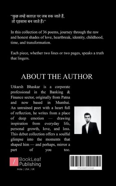 This collection of 36 poems by Utkarsh Bhaskar is not just a book - it's a journey through the evolving seasons of the soul. From the warmth of love to the chill of heartbreak, from childhood innocence to adult introspection, each poem captures a raw emotion wrapped in honest words. Some verses whisper, some ache, some heal. Without formal training, but with a heart full of experience, the poet pens down moments we've all lived but seldom voiced. If you've ever paused mid-thought, mid-life, mid-love - this book will feel like a mirror you didn't know you needed.