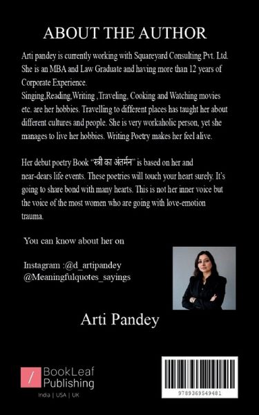 Her debut poetry Book "स्त्री का अंतर्मन" is based on her and near-dears life events. These poetries will touch your heart surely. It's going to share bond with many hearts. This is not her inner voice but the voice of the most women who are going with love-emotion trauma.