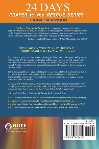 In a world that has apparently gone mad, it appears as if people are replacing the Bible with guns. Safety seems to be a myth. TV, the Internet, print media, and the radio bombard us with tragic events, that shatter our communities and, ultimately, our world. Although the situation appears dismal, Author Fiona Harewood believes that prayer is still the answer for a confused and troubled world. In this transparent book, the author shares how God responded to the calls for help that she and others made amid challenging experiences, and how He came to their rescue. Sometimes His answer was, yes; sometimes, it was no. Sometimes He stepped in even before she had time to call on Him! 24 Days: Prayer to the Rescue, references individual miraculous accounts of life changing circumstances, and reveals a model that helps readers realize that their problems are solved when they focus, not on the problem, but on the Problem Solver! After reading 24 Days: Prayer to the Rescue Series, you will learn: that God has no favorites, and He still performs miracles for ordinary people, everyday; to persevere in every situation, knowing there is nothing too hard for God; to allow your faith in God to develop and to trust Him even when His answer is, "No" and that God is all-knowing, so sometimes He answers even before we call on Him.
