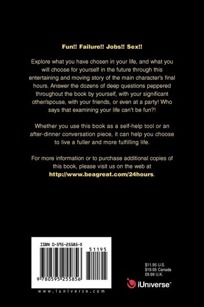 Fun!! Failure!! Jobs!! Sex!! Explore what have you chosen in the past, and what will you choose for yourself in the future through this story of one's final hours on this earth. Answer the deep questions peppered throughout the book by yourself, with your significant other/spouse, with your friends, or even at a party! Who says that examining your life can't be fun?! Whether you use this book as a self-help tool or an after-dinner conversation piece, it can help you choose to live a fuller life. For more information or to purchase additional copies of this book, please visit us on the web at http://www.beagreat.com/24hours.