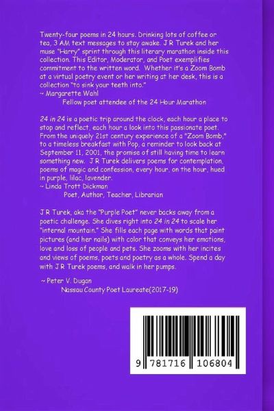 24 in 24 is a poetic trip around the clock, each hour a place to stop and reflect, each hour a look into this passionate poet. From the uniquely 21st century experience of a "Zoom Bomb," to a timeless breakfast with Pop, a reminder to look back at September 11, 2001, the promise of still having time to learn something new. J R Turek delivers poems for contemplation, poems of magic and confession, every hour, on the hour, hued in purple, lilac, lavender.