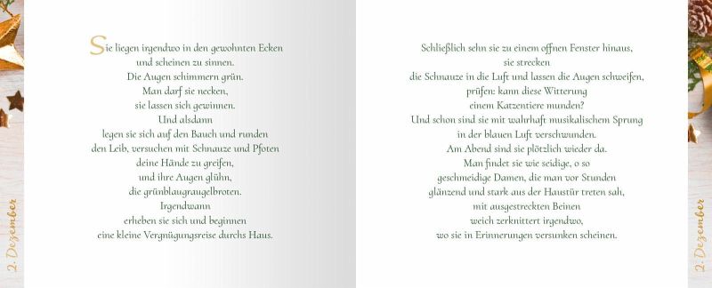 Kaum ein anderes Tier vermag solch eine Faszination auf uns Menschen auszuüben wie die Katze. Ihre Schönheit, ihre Anmut, ihr Stolz, ihre Unberechenbarkeit und ihre Rätselhaftigkeit wurden von Dichtern, Künstlern und Katzenliebhabern aus aller Welt portraitiert. Dieser Adventskalender inspiriert jeden Tag vor Weihnachten mit 24 schönen, verschmusten, verspielten, wilden und geheimnisvollen Geschichten und Gedichten rund um die geliebten Samtpfoten.