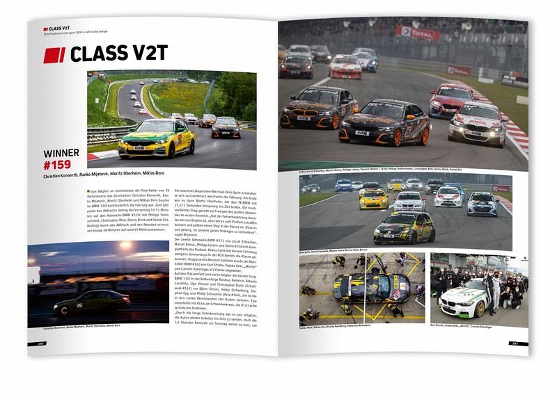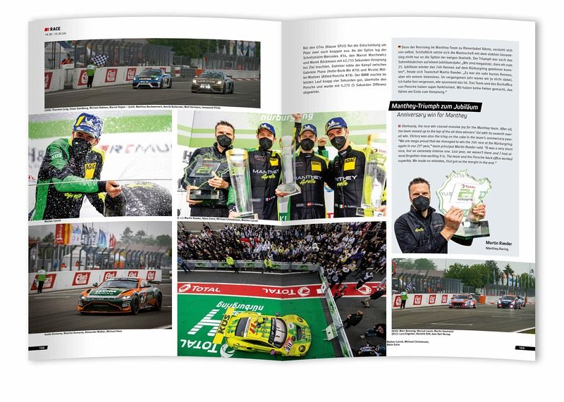 Herzschlagfinale beim 49. ADAC TOTAL 24h-Rennen auf der Nordschleife: Der siegreiche Manthey-Porsche hatte am Ende gerade einmal 8,817 Sekunden Vorsprung vor dem zweitplatzierten ROWE-BMW. Die Plätze drei bis sieben waren lediglich durch 5,6 Sekunden getrennt.Eine lange Unterbrechung wegen Nebels führte dazu, dass nach dem Restart nur noch dreieinhalb Stunden Fahrzeit auf der Uhr standen. Die Folge: Das 24-Stunden-Rennen wurde durch ein Sprintrennen entschieden. Tatsächlich stellte das Rennen mit einer Fahrzeit von knapp zehn Stunden einen neuen Minusrekord auf. Schuld daran waren einmal mehr die Wetterverhältnisse auf dem Nürburgring, die ein längeres Fahren nicht möglich machten. Am Ende ging es in vielen der 24 verschiedenen Klassen eng zu: Ob Porsche Cayman-Cup, Produktionswagen bis 2.000 ccm mit Turbo, Specials bis 2.600 ccm mit Turbo und bis 4.000 ccm mit Turbo, GT4 oder TCR: Hier fielen die Entscheidungen um den Sieg sehr knapp aus.Das Rahmenprogramm war erneut hochkarätig: Zum 30. Mal starteten die Young- und Oldtimer im 3h-Classic-Rennen, der Tourenwagen-Weltcup war zum siebten Mal dabei und die Rundstrecken-Challenge Nürburgring, Deutschlands älteste und größte Breitensportserie, eröffnete wie gewohnt das Renngeschehen am Donnerstagmorgen. Abgerundet wurde das Geschehen von einer Premiere: dem ersten Auftritt der Tourenwagen-Legenden aus der ehemaligen DTM.Das 24h-Jahrbuch beleuchtet auch in diesem Jahr ausführlich das Geschehen in allen 24h-Klassen sowie die Rennen des Rahmenprogramms und die Trainingssitzungen. Hunderte Fotos runden - ergänzt durch viele Tabellen und Statistiken - das Buch ab.