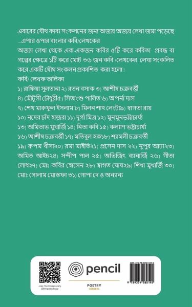 এবারের যৌথ কাব্য সংকলনের জন্য অজস্র অজস্র লেখা জমা পড়েছে ...এপার ওপার বাংলার কবি/লেখকের অজস্র লেখা থেকে এক-একজন কবির ৫টি করে কবিতা প্রবন্ধ বা গল্পের ক্ষেত্রে ১টি করে মোট ৩৬ জন কবি /লেখকের লেখা সংকলিত করে একটি যৌথ সংকলন প্রকাশিত করা হলো ! কবি/ লেখক তালিকা ১) রাফিয়া সুলতানা ২) রতন বসাক ৩) আশীষ চক্রবর্ত্তী ৪) মৌটুসী চৌধুরী৫) সিতাংশু পালিত ৬) অপর্না দাস ৭) শেখ মারুফুল ইসলাম ৮) মিলন শাহ লেংটা৯) স্বাগতা রায় ১০) নদের চাঁদ হাজরা ১১) দুর্গা মিত্র ১২) মুনমুনভট্টাচার্য্য ১৩) অমিতাভ মুখার্জি ১৪) নিতা কবি ১৫) কল্যাণ ভট্টাচার্য্য ১৬) আশীষ চক্রবর্ত্তী ১৭) মতিবুল হক১৮) শ্যামলী চক্রবর্তী ১৯) রুপম খীসা২০) রমা মাইতি২১) প্রসেন দাস ২২) নুপুর আঢ্য২৩) অমিত আইচ২৪) সন্দীপ পাল ২৫) অভিজিৎ ব্যানার্জি ২৬) গীতা লোধ২৭) মোঃ কবির হোসেন ২৮) স্বাগত ঘোষ২৯) শিখা মুখার্জি ৩০) মোঃ গোলাম মোস্তফা ৩১) গোপা দে ও অন্যান্য