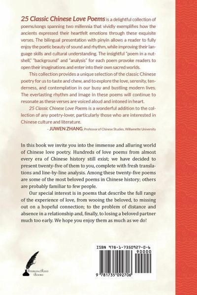 In this book we invite you into the immense and alluring world of Chinese love poetry. Hundreds of love poems from almost every era of Chinese history still exist; we have decided to present twenty-five of them to you, complete with fresh translations and line-by-line analysis. Among these twenty-five poems are some of the most beloved poems in Chinese history; others are probably familiar to few people. Our special interest is in poems that describe the full range of the experience of love, from wooing the beloved, to missing out on a hopeful connection; to the problem of distance and absence in a relationship and, finally, to losing a beloved partner much too early. We hope you enjoy them as much as we do!