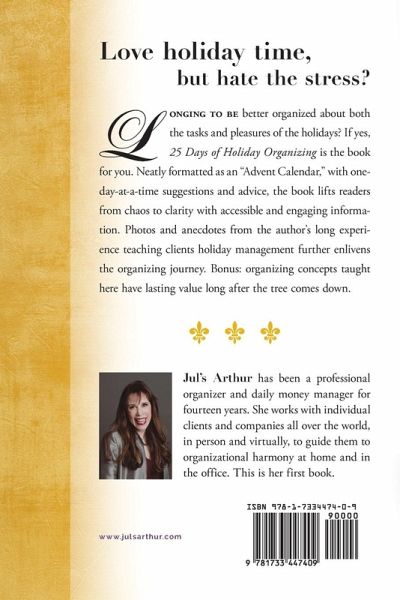 Holiday Organization Made Easy Love holiday time, but hate the stress? If you long to make your holidays more organized -- and so more fun -- Jul's Arthur's 25 Days of Holiday Organizing is the book for you. It's truly unique, structured as an Advent calendar with one-day-at-a-time practical tips that will take you from chaos to clarity. Photos and stories from the author's long experience teaching holiday organization provide a behind-the-scenes organizing journey that further enlivens the details. Bonus: organizing concepts you'll learn from Jul's for the holidays will help you master everyday organizing long after the tree comes down. Jul's shared humor and examples from her life will have you feeling as if she is your very own professional organizer guiding you to action. Included in her book are online links and searchable terms to locate gift ideas and products shown in its pages. 25 Days of Holiday Organizing is an awesome gift in itself, suitable for family, friends, teachers, co-workers, colleagues, and social groups. Each day illustrates an Organizing Concept with specific tips such as: · How to Repurpose fruit gift boxes and canning jars for storing fragile ornaments · Think Vertical - hang items, make use of spaces under the stairs to maximize decoration storage, even in small places · Gift-Giving Ideas that cover must-haves for friends and family · Kid-Friendly Tips that will promote family fun · Prepare Ahead easy recipe for holiday parties and entertaining · Stringing Holiday Lights like a pro -- an easier way to light your tree without the fuss · Easy Watering Tool to keep your Christmas tree fresh Save time, save money and save your sanity with 25 Days of Holiday Organizing!