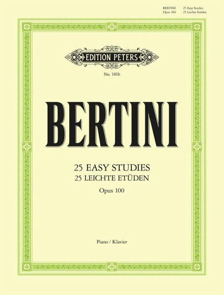 25 Easy Studies, Op. 100, for solo piano composed by Henri Bertini, edited by Adolf Ruthardt. Bertini's instructive piano etudes are still considered to this day as both melodic and stimulating works of instruction, designed to teach technique and develop skills through technically challenging studies and expressive melodies and harmonies. 25 Leichte Studien op. 100 für Klavier von Henri Bertini, herausgegeben von Adolf Ruthardt. Bertinis Klavieretüden gelten bis heute als anregende Lehrwerke, die darauf abzielen, technische Fähigkeiten durch anspruchsvolle, sowie melodisch und harmonisch ausdrucksstarke Etüden zu entwickeln.