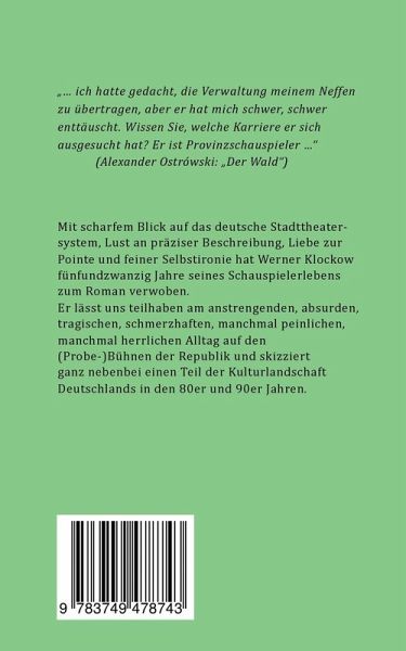 Mit scharfem Blick auf das deutsche Stadttheatersystem, Lust an präziser Beschreibung, Liebe zur Pointe und feiner Selbstironie hat Werner Klockow fünfundzwanzig Jahre seines Schauspielerlebens zum Roman verwoben.Er lässt uns teilhaben am anstrengenden, absurden, tragischen, schmerzhaften, manchmal peinlichen, manchmal herrlichen Alltag auf den (Probe-)Bühnen der Republik und skizziert ganz nebenbei einen Teil der Kulturlandschaft Deutschlands in den 80er und 90er Jahren.