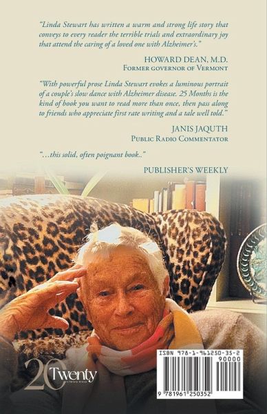 "Linda Stewart has written a warm and strong life story that conveys to every reader the terrible trials and extraordinary joy that attend the caring of a loved one with Alzheimer's." HOWARD DEAN, M.D. Former governor of Vermont "With powerful prose Linda Stewart evokes a luminous portrait of a couple's slow dance with Alzheimer disease. 25 Months is the kind of book you want to read more than once, then pass along to friends who appreciate first rate writing and a tale well told." JANIS JAQUTH Public Radio Commentator "...this solid, often poignant book.." PUBLISHER'S WEEKLY