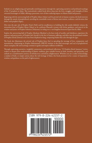 Embark on an enlightening and spiritually enriching journey through the captivating narratives and profound teachings of the 25 prophets in Islam. This meticulously crafted book delves deep into the lives, struggles, and triumphs of these esteemed messengers of Allah, offering a panoramic view of their enduring impact on Islamic belief and practice. Beginning with the unwavering faith of Prophet Adam (Adam) and his pivotal role in human creation, the book traverses through the annals of prophethood, unveiling the remarkable stories of divine intervention, resilience, and devotion that define each prophet's legacy. Dive into the epic tale of Prophet Noah (Nuh) and his steadfastness in building the Ark amidst disbelief, witness the miraculous feats of Prophet Moses (Musa) as he confronts Pharaoh's tyranny with divine guidance, and marvel at the wisdom and justice of Prophet Solomon (Sulayman) in ruling over a vast kingdom bestowed upon him by Allah. Explore the unwavering faith of Prophet Abraham (Ibrahim) as he faces trials of sacrifice and obedience, experience the patience and perseverance of Prophet Job (Ayyub) in the face of immense suffering, and delve into the profound wisdom of Prophet David (Dawud) as he rises from shepherd to king, composing Psalms that echo through the ages. The book also illuminates the pivotal role of Prophet Jesus (Isa) in spreading the message of love, compassion, and monotheism, culminating in Prophet Muhammad's (PBUH) mission as the final messenger and seal of prophethood, whose exemplary life and teachings continue to guide and inspire millions worldwide. Through captivating narratives, insightful commentary, and profound reflections, "25 Prophets Book Summary" invites readers to deepen their understanding of Islamic tradition, gain valuable lessons in faith, morality, and spirituality, and embark on a transformative journey of self-discovery and divine enlightenment. Whether you are a seeker of knowledge, a student of faith, or simply curious about the rich heritage of Islam, this book promises to be a source of inspiration, wisdom, and guidance on the path of righteousness.