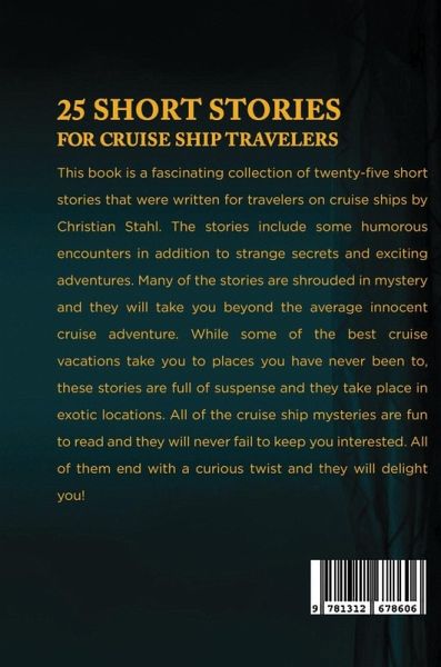 This book is a fascinating collection of twenty-five short stories that were written for travelers on cruise ships by Christian Stahl. The stories include some humorous encounters in addition to strange secrets and exciting cruise ship mysteries. Many of the stories are shrouded in mystery and they will take you beyond the average innocent cruise trip. While some of the best and most cozy cruise ship mysteries take you to places you have never been to, these stories are full of suspense and they take place in exotic locations. All of the cruise ship mysteries are fun to read and they will never fail to keep you interested. All of the cruise ship mysteries end with a curious twist and they will delight you!