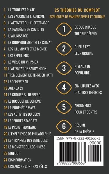25 théories du complot expliquées en 6 points : 1 - Ce que représente chaque théorie 2 - Leur origine 3 - Niveau de popularité 4 - Similitudes avec d'autres théories 5 - Arguments contre et en faveur 6 - Résumé de la théorie Découvrez 25 théories du complot avec des idées aussi diverses que : - La Terre est plate - Les vaccins et l'autisme - L'attentat du 11 septembre - La fausse pandémie, le non-atterrissage sur la Lune - Les Illuminati, un gouvernement mondial et la désinformation - Les Reptiliens, le tremblement de terre d'Haïti et HAARP - Chemtrail et Agenda 21 - Le groupe Bilderberg et le Bohemian Grove - La prophétie maya et les activités du CERN - Le projet Stargate et le projet Montauk - L'expérience de Philadelphie - Le triangle des Bermudes - Le monstre du Loch Ness et le Bigfoot - Les oiseaux ne sont pas réels Apprenez à reconnaître les théories du complot et à cultiver un regard critique sur les informations que vous recevez et partagez. Un livre idéal pour les esprits informés et curieux.