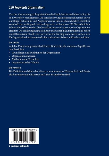 Von der Abstimmungskollegialität über die Fayol-Brücke und Make or Buy bis zum Workflow Management: Die Sprache der Organisation zeichnet sich durch unzählige Fachtermini und Anglizismen aus. Einen ersten schnellen Überblick verschafft das vorliegende Nachschlagewerk. Anhand von 250 übersichtlichen Schlüsselbegriffen werden die Grundkonzepte und -theorien der Organisation erläutert. Die Erklärungen sind kompakt und verständlich formuliert und bieten somit Basiswissen für alle, die einen schnellen Einstieg in die Praxis suchen, sich für Organisation interessieren oder ihr vorhandenes Wissen auffrischen möchten.